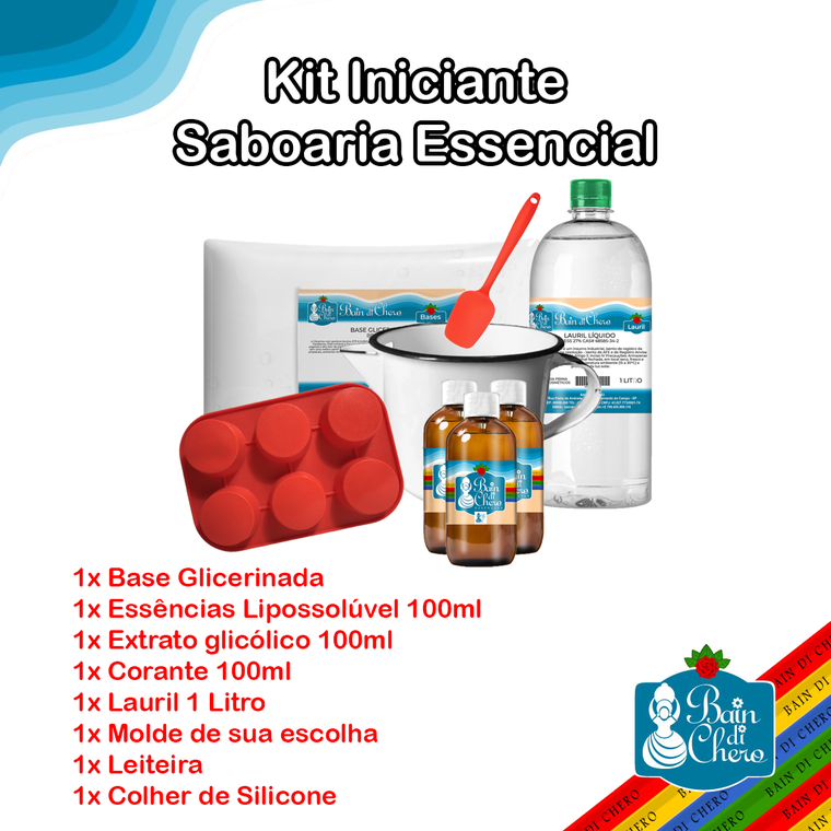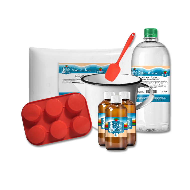 Kit com base 1kg, lauril, essência, extrato, corante 100ml, molde, leiteira e colher. Crie sabonetes artesanais únicos desde o início!