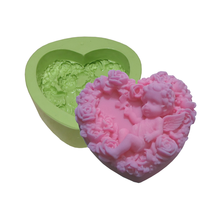 Molde de silicone Coração com Flores e Anjo (7x6x3cm) para velas, sabonetes ou resina. Design celestial, fácil de desmoldar e durável!