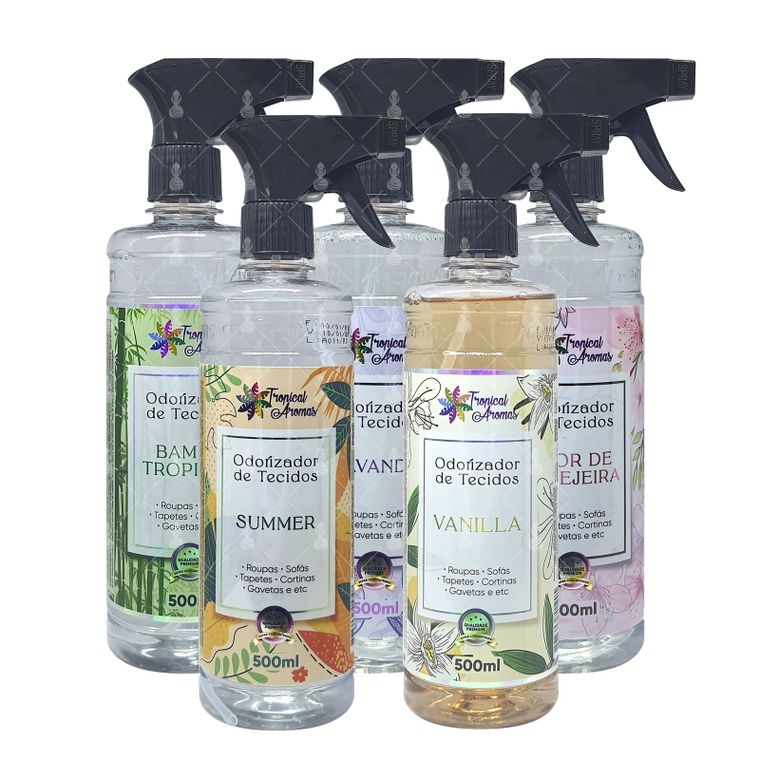 Odorizador 500ml para tecidos em kits de 1, 2, 3 ou 5 unidades. 8 aromas tropicais para camas cheirosas e livres de odores!
